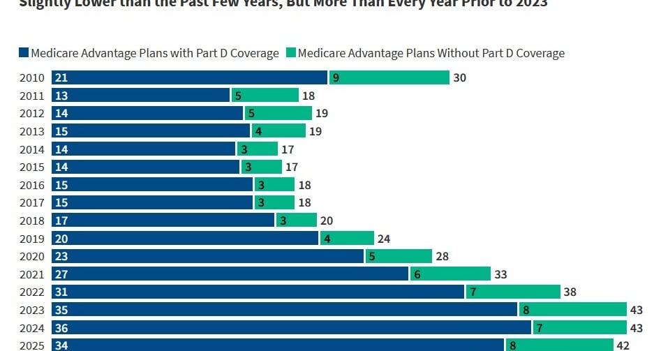 The past two years have been financially difficult for Medicare Advantage plans. If you recall an earlier post of mine, many insurers reduced the number counties and states in which they offer MA plans. In 2024, MA plans had a combined underwriting loss of $5.7 billion. While the CMS increased the average reimbursement rate by over 5% for 2026, this is likely insufficient for many insurers. Not all states will see a reduction in plans, though 35 states, DC, and Puerto Rico will have fewer plans. On a positive note, CMS noted that the average monthly premium across MA including special needs plans will decrease from $16.40 in 2025 to $14.00 in 2026. This may not be enough stave off MA enrollment decreases, which are projected to shrink from 34.9 million in 2025 to 34 million in 2026.